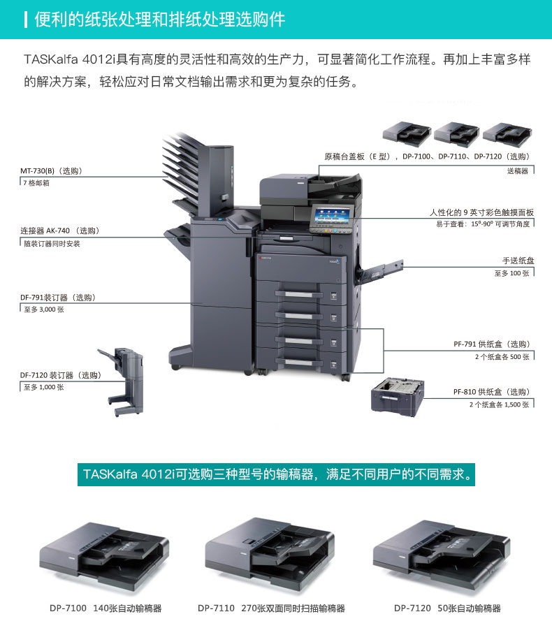 | 产品特性 | 9英寸彩色多功能触摸面板 快速的预热时间 三种型号的输稿器可供选购 |