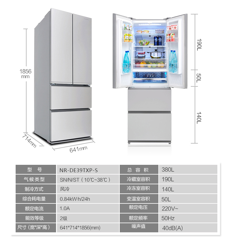 松下(Panasonic)380升法式多门冰箱家用变频风冷银离子除菌钢化玻璃NR-DE39TXP-S