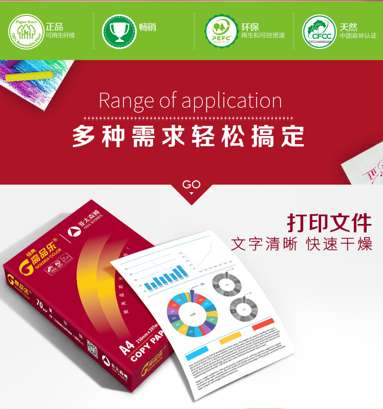 亚太森博(Asia Symbol)高品乐70gA4打印纸复印纸70g木浆纸a4打印纸500张 70克A4整箱8包 8包/箱(4000张)