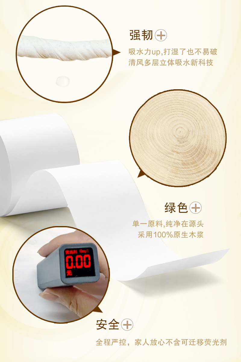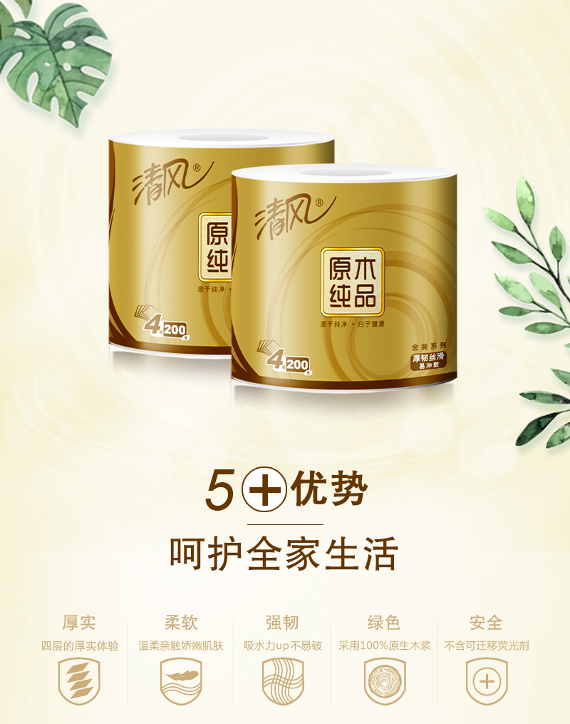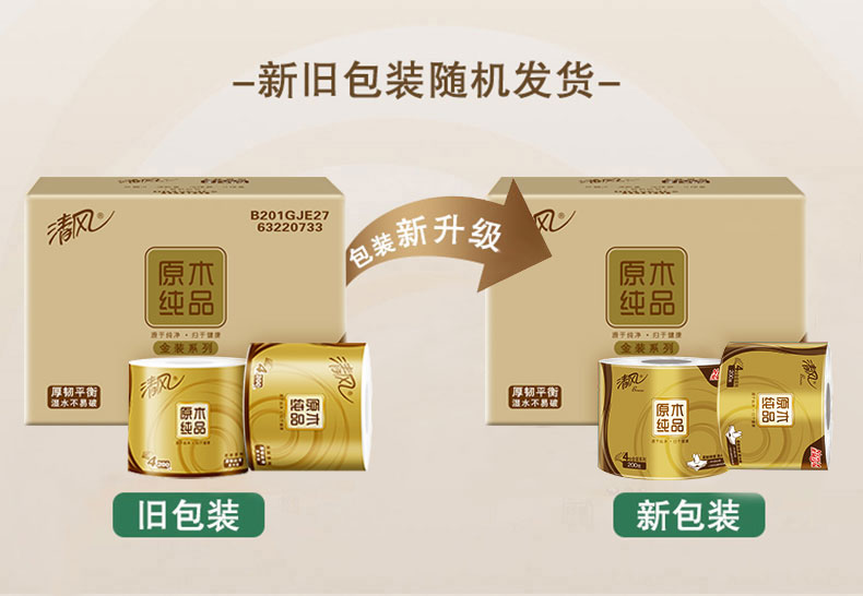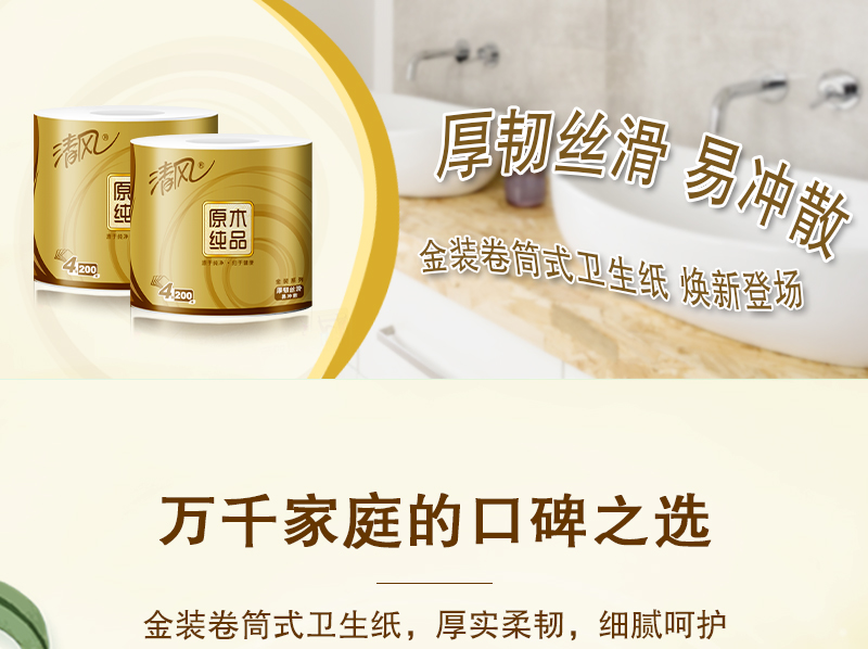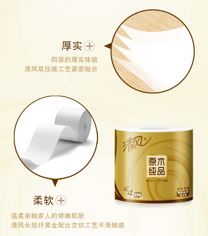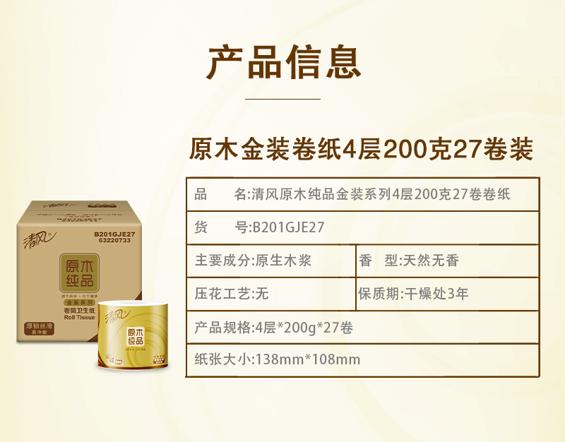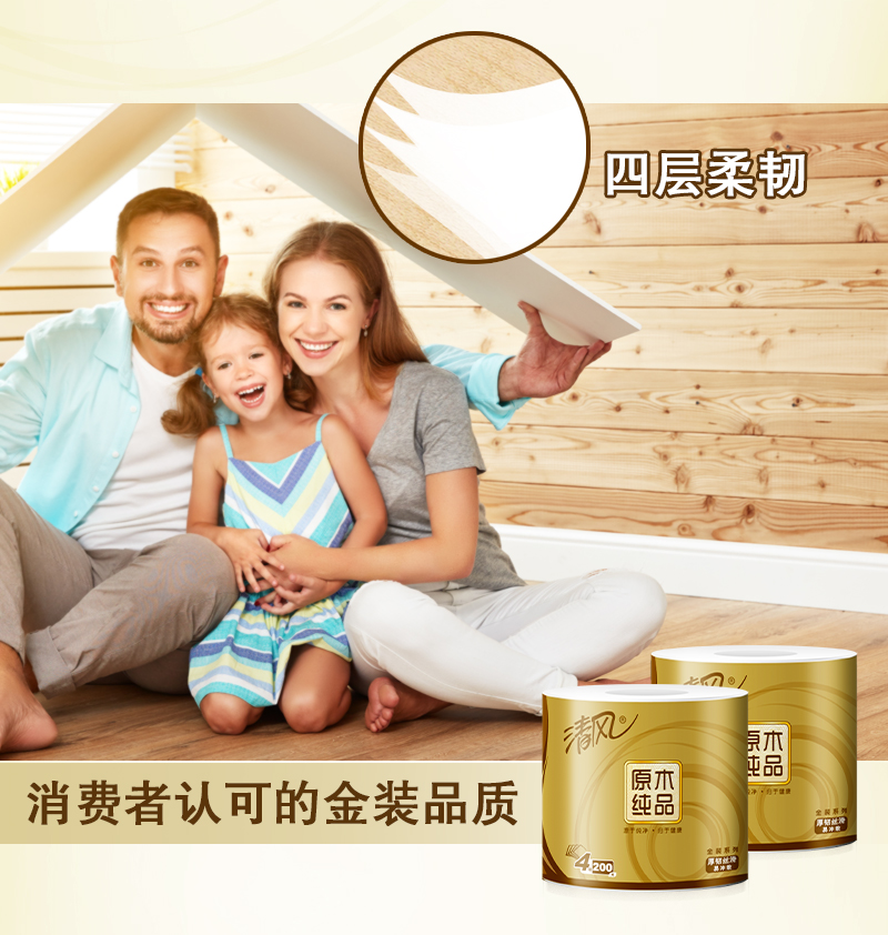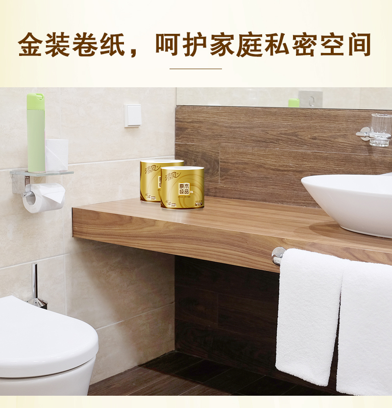 清风卷纸金装4层200克27卷纸巾卫生纸家用实惠装整箱厕纸有芯卷纸