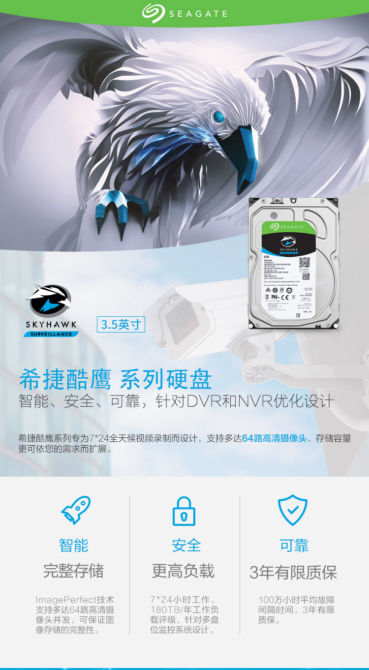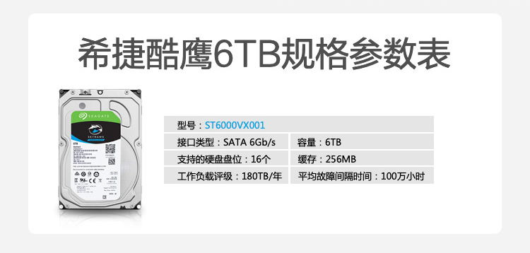 希捷(SEAGATE) 监控硬盘 希捷酷鹰 安防监控录像机用机械硬盘 SATA接口 3.5英寸 6TB【ST6000VX001】