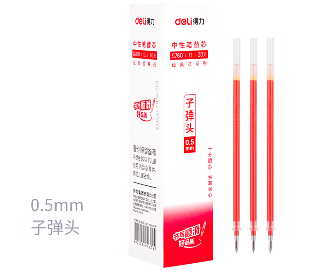 得力0.5子弹头中性笔笔芯S760红 单支装