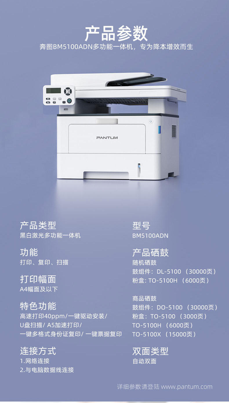 奔图BM5100ADN黑白激光多功能打印机自动双面打印复印扫描一体机
